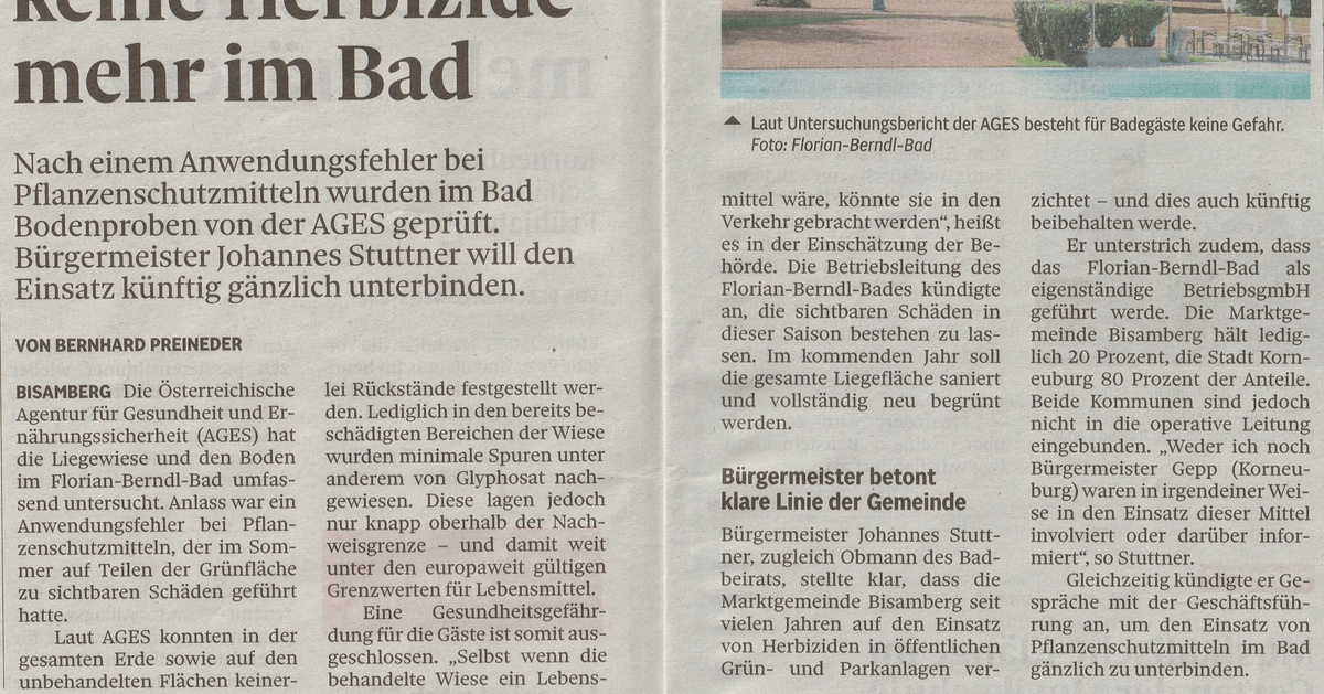 Es wurden Proben der Liegewiese und des Bodens durch die AGES (Österreichische Agentur für Gesundheit und Ernährungssicherheit) untersucht. Rückstände wurden festgestellt!In der Presseaussendung vom Berndlbad heißt es, es besteht keine Gefahr für Gäste, nachdem es im Sommer zu einem Anwendungsfehler…